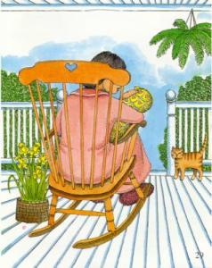 on bright sunny days, Mommy sits outside and holds and cuddles Mike. She