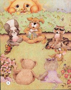 telling or reading a story, children laughing and people singing. Sounds of